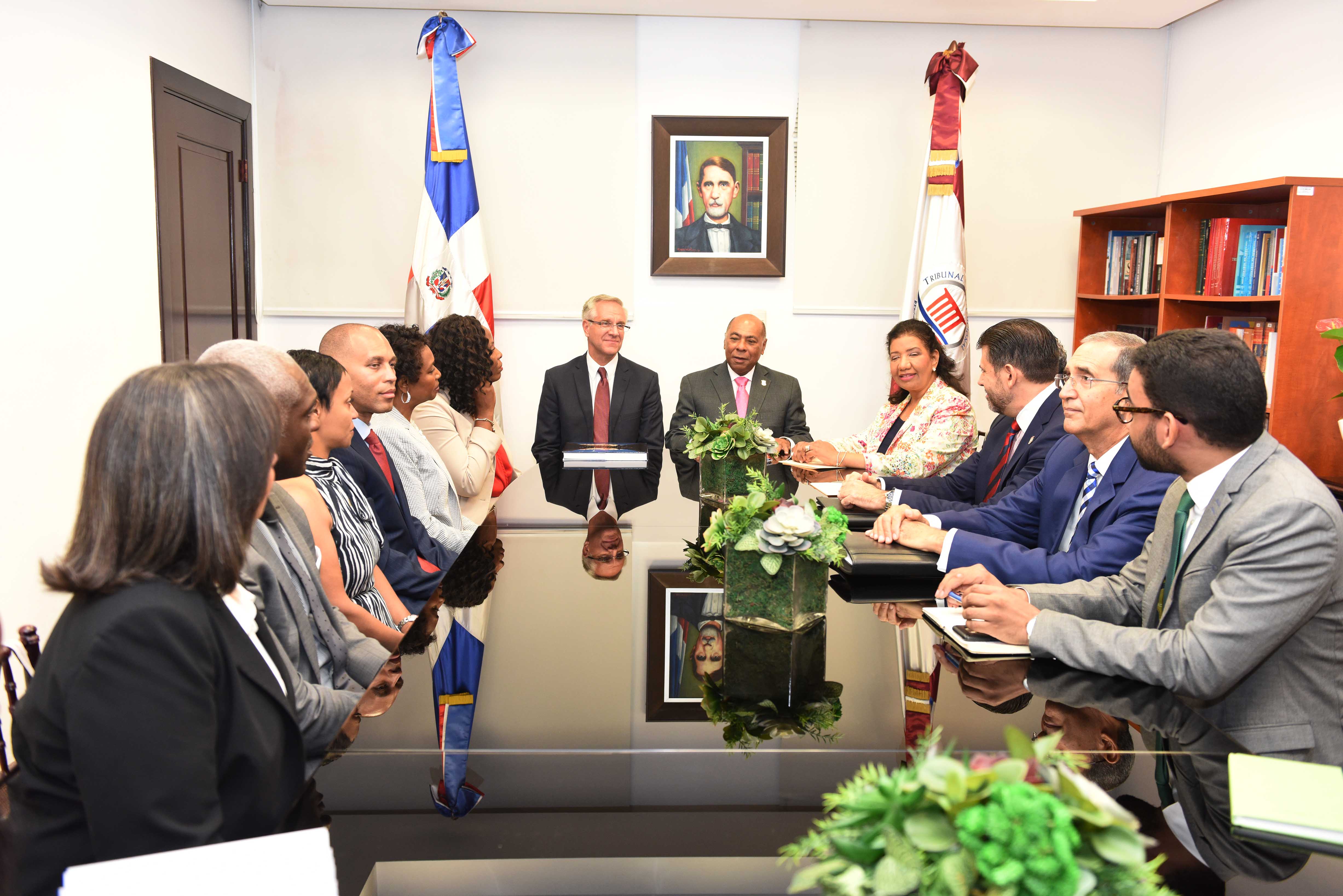 La comitiva, encabezada por el encargado de Negocios de la embajada estadounidense en el país, Robert Copley, fue recibida en el Salón del Pleno por el presidente del TC, magistrado Milton Ray Guevara, junto a los jueces Leyda Margarita Piña Medrano, Lino Vásquez Sámuel, primera y segundo sustituto del presidente, respectivamente; Justo Pedro Castellanos Khoury y Víctor Joaquín Castellanos Pizano, y el licenciado Amaury Reyes.